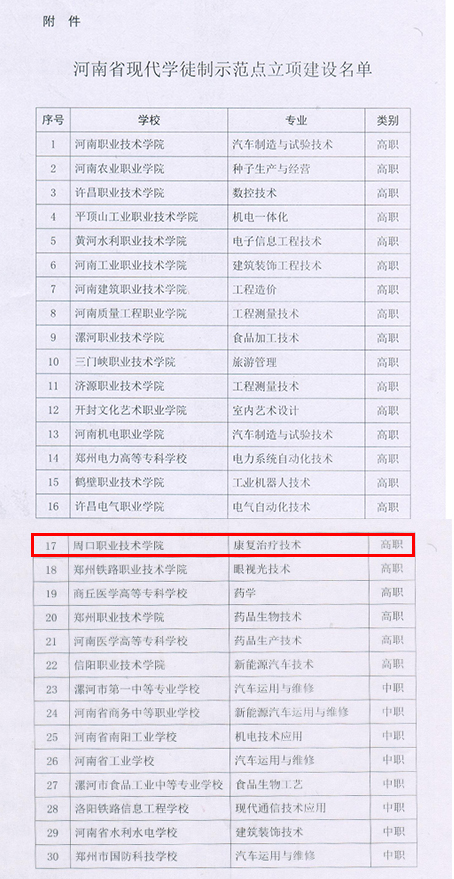 12月30日,河南省教育厅公布河南省首批现代学徒制示范点立项建设名单,周口职业技术学院康复治疗技术专业成功入选。此次获批河南省现代学徒制示范点建设项目,是bw官网多年来深化产教融合、校企合作的成果,标志着bw必威西汉姆联官方网站在校企合作共育人才的培养模式实践探索方面又有了更大的进步,同时也为bw必威西汉姆联官方网站高质量发展再添新的亮点。