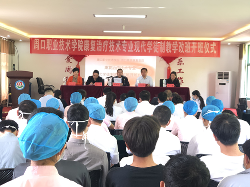 在开班仪式上,周口惠济康复医院董事长兼院长王希振首先致辞,表示将以此次现代学徒制教改班开班为契机,充分发挥该院在康复医疗领域的技术优势,严格履行双方《医教融合协议》的义务,在做好为康复患者服务的同时,认真研究现代学徒制教学的新思路、新途径,抽调年富力强、经验丰富的专业医生做好老师带徒工作,注重言传身教,注重患者体验,注重学习创新,注重能力提升,注重经验总结,注重成果转化,以理论指导实践,以实践丰富理论。
