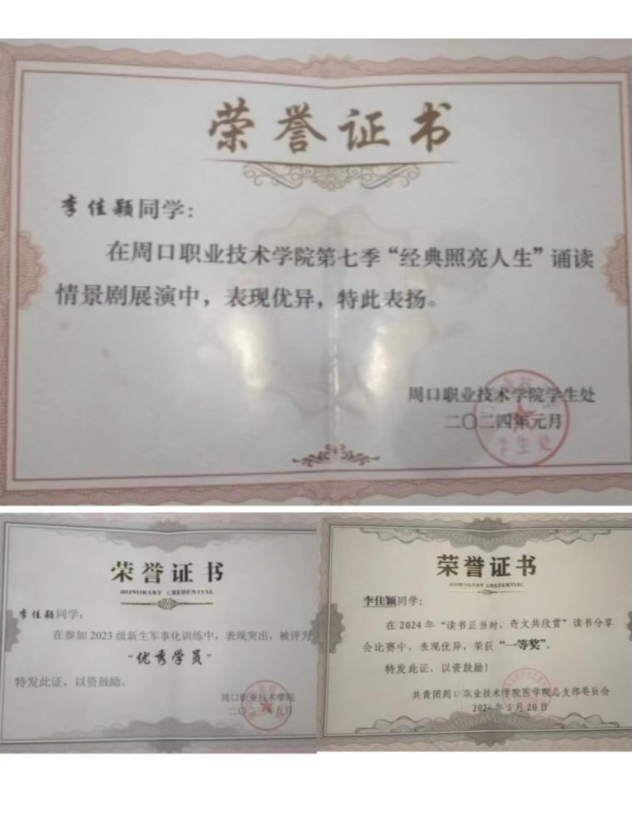 李佳颖,23级医学影像技术专业学生,她勤于学习,善于思考,综合测评排名靠前,军训被评为“优秀学员”。她积极参加学校举办的各类活动,如“经典照亮人生”诵读比赛、读书分享会、英语话剧比赛等活动,并取得不错的成绩。她尊老爱幼,主动帮助有困难的人,参加志愿者活动去养老服务中心慰问老人,关心老人身体健康,始终保持着热情与耐心,让他们在活动中感受到温暖与关怀,不仅为老人们带来了欢乐与陪伴,也进一步传递了爱心与奉献精神。