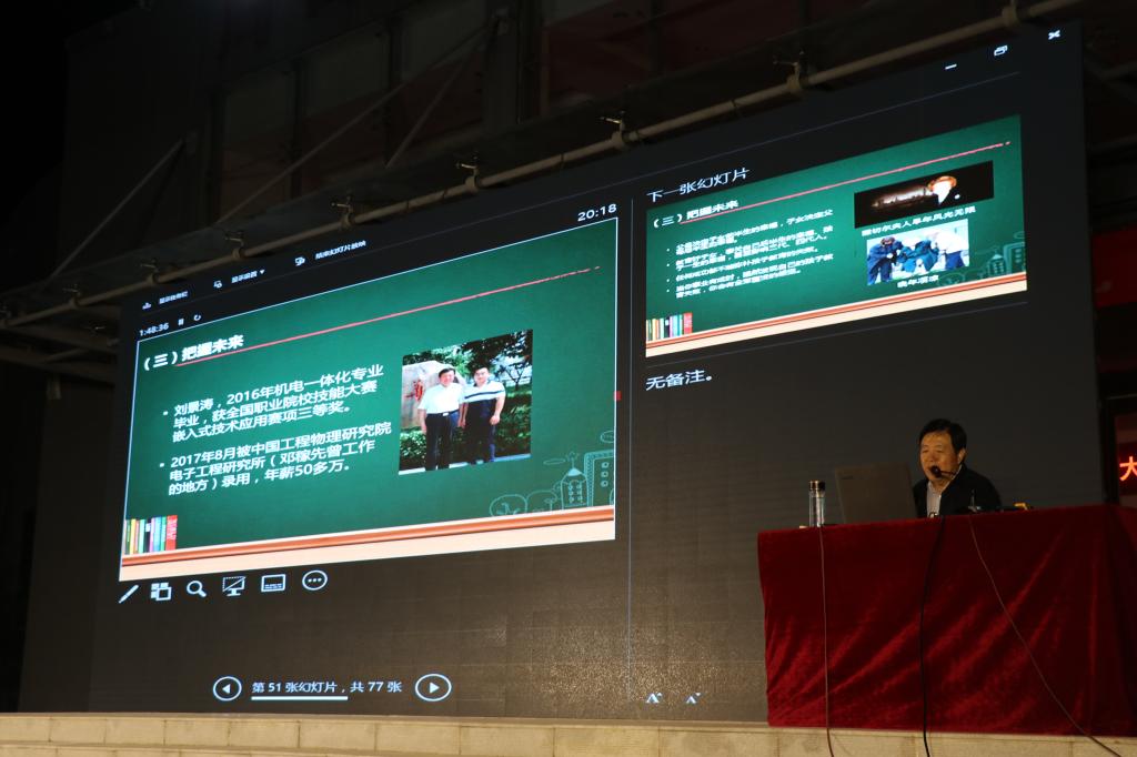 “人生的道路虽然漫长,但要紧的只有几步,特别是当人年轻的时候。”刘士欣以著名诗人柳青的名言引入,围绕坚定一个信念:我一定能成才;认清两个转变:基础教育向高等职业教育转变、未成年人向成年人转变;追求三个做好:挥别过去、拥抱现在、把握未来;践行五讲五重:讲学习、重修为;讲规则、重法纪;讲责任、重担当;讲诚信、重践诺;讲健康、重安全。刘士欣用一幅幅生动的图片、一个个鲜活的故事、一组组真实的数据分析大学生面临的环境条件和主要任务,帮助新生了解学校的人才培养思路,合理规划人生道路,教育引导大学生扣好人生第一粒扣子,开启有意义的大学生涯。
