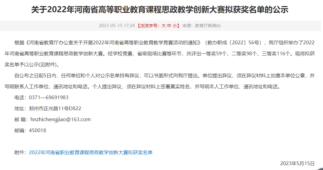 近日,河南省教育厅发布了《关于2022年河南省高等职业教育课程思政教学创新大赛拟获奖名单的公示》名单,bw官网医学影像技术教师赵燕荣获财经农医相关类课程组一等奖,大学英语教师赵楠荣获公共基础课程组三等奖,实现了bw官网在省级教学技能竞赛中新的突破。
