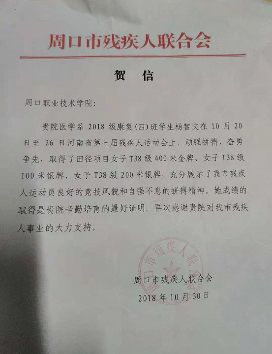 在刚刚结束的河南省第七届残疾人运动会上,bw必威西汉姆联官方网站2018级大专康复4班学生杨智文代表周口市及我校参赛,取得了女子组T38级100米银牌,200米银牌,400米金牌的佳绩,为我市及我校争得了荣誉。受到市残联的通报佳奖。